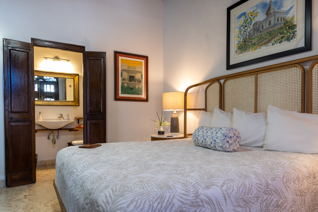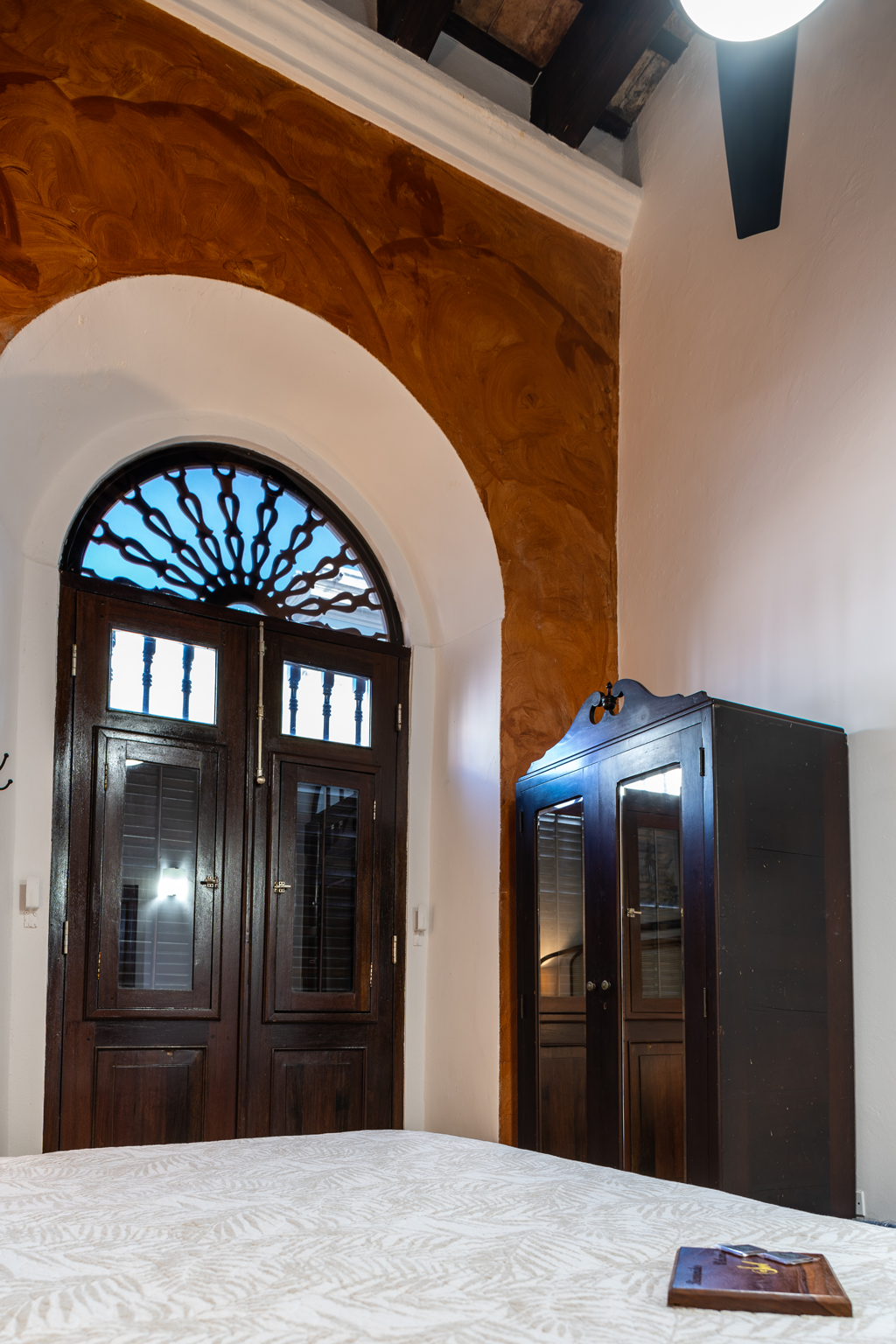 Providing the best of both worlds the charm and elegance of the 17th century Colonial Home while wrapping in all the modern amenities needed for the perfect getaway. Designed with thoughtful amenities and beautiful decor sure to provide an experience just as unique as you. A beautifully presented room offering 18 ft. ceilings, with Clay Bricks and Ausubo Wood beams (Iron Wood), modern yet stylish Spanish furniture richly decorated bedroom with a big comfy King size bed.